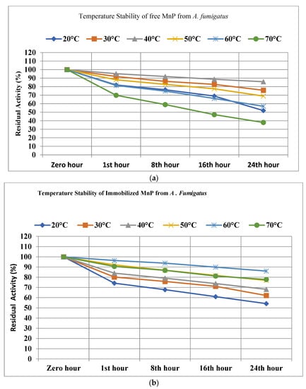(a) Temperature stability of free MnP from A. fumigatus. (b) Temperature stability of immobilized MnP from A. fumigatus.