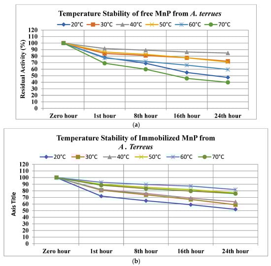 Whereas entrapped MnP from A. terreus resulted in 81.9% at 60 °C and 75.8% at 70 °C while free MnP showed 59.6% and 39.9%, respectively, at 20 °C, 30 °C, 40 °C and 50 °C, agar–agar-entrapped MnP showed 52%, 59%, 63.4%, and 76.9% residual activity, and free MnP resulted in 47.4%, 72.2%, 84.8%, and 71.1% activity (Figure 9).