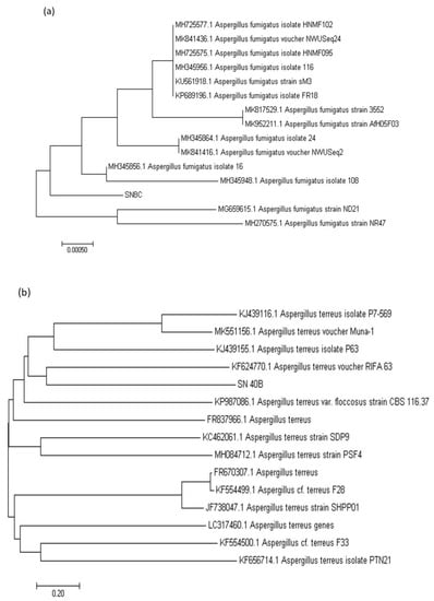 (a,b) Phylogenetic tree constructed through the maximum parsimony method using MEGA 6.0 []. The sequence obtained from ITS regions of rDNA of isolated fungi were making good clads with fungi sequences from BLAST. (a) The phylogenetic tree of SN8c identified as A. fumigatus, and (b) the phylogenetic tree of SN40b identified as A. terreus.
