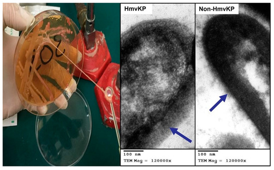 The positive result for the string test. A viscous thread-like string of more than or equal to 5 mm in length is formed, indicating positive for the hypermucoviscosity phenotype. TEM shows the surface polysaccharides in hmvKp and non-hmvKp isolated in this study. The arrows are directed to the extracellular polysaccharide layer of hmvKp, measured at an average of 87 nm, while non-hmvKp measured at an average of 22 nm.