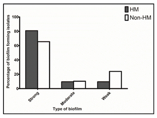Forming biofilm is a crucial step in the pathogenesis of Kp-caused diseases. Biofilm increases resistance to environmental stresses and antimicrobial agents and serves as a reservoir for subsequent gene exchange. Many virulence factors help Kp to produce biofilm, either directly by encouraging more remarkable adhesion or biofilm maturation and indirectly by preventing biofilm formation by competing bacteria in their colonization niche [71]. In the current study, biofilm formation assays revealed that most hvKp isolates (75%) were strong biofilm producers, consistent with a previous study in Iraq [72]. Additionally, Nirwati et al. (2019) reported that 85.63% of Kp isolates were biofilm producers, and 64.7% of these isolates were strong biofilm producers, according to a related study by Hassan et al. (2011) [73,74]. Our data also showed no differences in the biofilm formation of hmvKp and non-hmvKp phenotypes among each strong, moderate, and weak biofilm-forming isolates; these results were consistent with clinical isolates investigated in Soto et al.’s study [75,76].