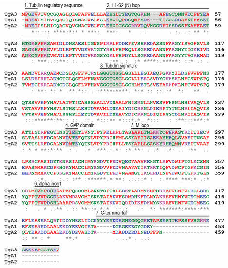 - Findeisen, P.; Muhlhausen, S.; Dempewolf, S.; Hertzog, J.; Zietlow, A.; Carlomagno, T.; Kollmar, M. Six subgroups and extensive recent duplications characterize the evolution of the eukaryotic tubulin protein family. Genome Biol. Evol. 2014, 6, 2274–2288. [Google Scholar] [CrossRef]
