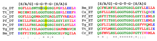 - Sievers, F.; Higgins, D.G. Clustal Omega for making accurate alignments of many protein sequences. Protein Sci. 2018, 27, 135–145. [Google Scholar] [CrossRef]