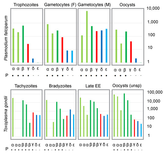 To date, RNA-Seq and mass spectrometry (MS) studies have been carried out for several key P. falciparum and T. gondii stages. These data provide some insight into the expression of tubulin genes in zoite and gametocyte (pre-gamete) forms [59,60,61,62,63]. However, there are several caveats to these data. For example, although γ-tubulin is essential, peptides derived from it are not identified in all life cycle stages. This disparity likely represents a failure to detect peptides from less abundant proteins in stages that are technically more challenging to purify. Conversely, MS datasets for Toxoplasma tachyzoites and bradyzoites detect low levels of unique α2- and α3- peptides, while normalized RNA-Seq profiling does not detect significant transcripts for these tubulins. Lastly, while the Toxoplasma data are represented as normalized counts and were generated by the same research lab using comparable workflows, the Plasmodium data are from different labs and were not similarly processed by the original investigators. Despite these shortcomings, the existing highly normalized data extracted from VEuPathDB suggests that the transcription of δ- and ε-tubulin genes in Plasmodium is specific to microgametocytes, whereas the synthesis of δ- and ε-tubulin proteins in Toxoplasma may be regulated post-transcriptionally.