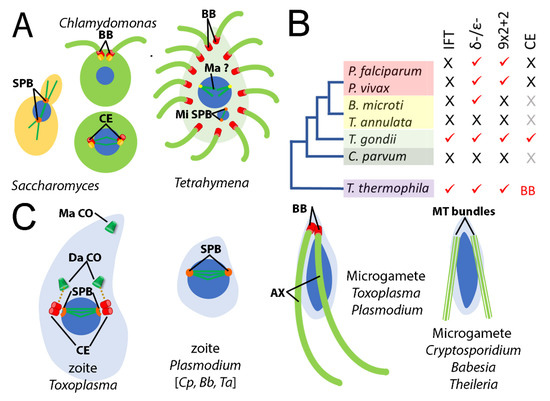 Apicomplexan parasites are located within the Alveolata, a large and diverse group of eukaryotic microorganisms that also includes ciliates and dinoflagellates [80,81,82]. Many alveolates construct canonical 9 × 2 + 2 axonemes to form motile cilia or flagella [83]. In fact, the ciliates Tetrahymena and Paramecium are well-established model systems for the study of ciliary function [78,84]. The recent expansion of sequenced apicomplexan genomes provides an opportunity to analyze members of the tubulin superfamily relative to those represented in ciliates. A previous study evaluated several apicomplexans, along with Tetrahymena and Paramecium, in the context of reconstructing the evolutionary history of the centriole [22]. That work demonstrated that Toxoplasma and Plasmodium have fewer homologs for core (ancestral) centriole components relative to Tetrahymena and Paramecium. While ciliates such as Tetrahymena generally occupy an extracellular, predatory niche that requires persistent axoneme-based motility, apicomplexans are obligate intracellular parasites. The asexual (zoite) stages of apicomplexans are not flagellated; these forms may use an unusual actin-based gliding motility to move and to invade host cells [43]. Therefore, the function of flagella in apicomplexans is, at most, reduced to a role in microgamete fertilization during the transient sexual cycle. Some, but not all apicomplexans harbor genes for δ- and ε-tubulins, and some but not all apicomplexan microgametes construct centrioles, basal bodies and flagellar axonemes (Figure 6).