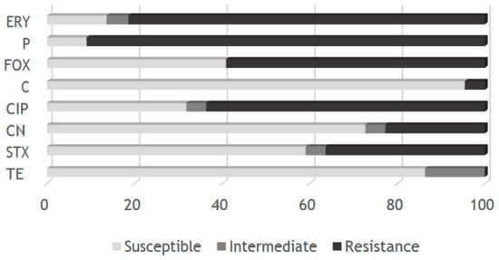 Figure 1. Antibiotic susceptibility profile of Staphylococcus isolates; TE-tetracycline; STX—Trimethoprim-Sulfamethoxazole; CN—Gentamicin; CIP—Ciprofloxacin; C—Chloramphenicol; FOX—Cefoxitin; P—Penicillin; ERY—Erythromycin.