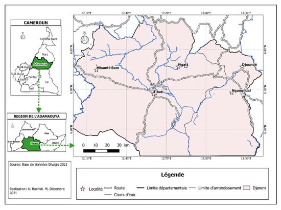 The Djerem Division is located to the south of Adamawa region, and it covers about 13,283 km2. It is situated between 6.10° and 7.0° north and 12.00° and 13.5° east. The climate is of the Sudanian type with two seasons: One dry season (from October to March) and one rainy season (from April to September). Its hydrographic network is dense, and the main rivers are Djerem and Meng rivers. The vegetation is characterized by savannah. One part of the Djerem division includes the Mbam and Djerem reserve (Figure 1), a protected area where several species of wild animals are living.