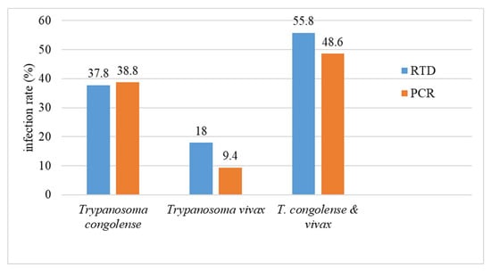 In the present study, we used an immunological diagnostic test, the Very Diag Kit, which was designed using TvGM6 recombinant protein and TcCB1 protein as antigens [12] to detect specifically T. vivax [13] and T. congolense [14], respectively. Compared to the PCR-based methods, it has the advantage of being easy to perform, provides results within 20 min, and can be carried out in the field or at the point of care. Immunological tests, however, have limitations, depending on the antigens they use, in terms of sensitivity and specificity in the identification of infecting trypanosomes. Thus, for example, Lumbala et al. (2018) [15] working on human African trypanosomiasis (HAT) in RDC compared with each other and with CATT (card agglutination test for trypanosomiasis) the accuracy of two RDTs: SD Bioline HAT (using natural antigens) and the more recently developed SD Bioline HAT 2.0 using recombinant antigens. SD Bioline showed the best sensitivity (71.2%) followed by CATT (62.5%) and SD Bioline HAT (59%). In terms of specificity, the three tests were roughly comparable: CATT (99.2%), SD Bioline HAT (98.9%), and SD bioline HAT 2.0 (98.1%). Similarly, Lopez-Albizu et al. (2020) [16] working on Chagas disease (caused by T. cruzi) in Argentina used two RDTs: Ab standard Diagnosis SD Bioline and Check Chagas Wiener Lab; they displayed, respectively, 97.2% and 93.4% sensitivity, and 91.7% and 99.1% specificity. Furthermore, many epidemiological studies on various populations using RTDs specific for Chagas disease have revealed a wide variability in their performance with sensitivity values ranging from 33% to 100% and specificity ranging from 94% to 99.9% [17,18]. Moreover, the sensitivity of the tests also seems to vary according to the nature of the samples; thus, the sensitivity of tests performed on serum may vary from 96 to 100% [17,19,20,21] while they can vary from 96 to 62.5% whole blood samples is tested [21,22]. As a consequence, Lopez-Albizu et al. (2020) [16] consider the results recorded using RDTs must be confirmed by other more specific serological tests or by PCR.