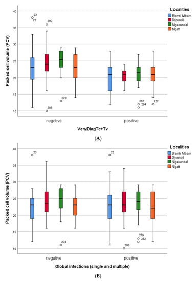 (A) Comparison of hematocrit rate (PCV) of trypanosome-infected (whatever the infecting species) and uninfected cattle, in the four sampling sites. Here, cattle infection was identified using the Very Diag Kit. (B) Comparison of hematocrit rate (PCV) of trypanosome-infected (whatever the infecting species) and uninfected cattle, in the four sampling sites. Here, cattle infection was identified using PCR technique.