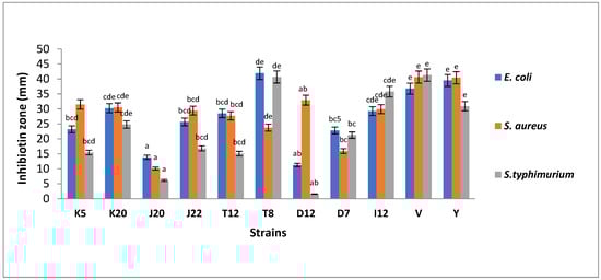 The antibacterial activity of LAB strains against pathogenic E. coli ATCC 8739, S. aureus ATCC 6538 and S. typhimurium ATCC 14028. Each bar represents mean of duplicate determinations (n = 2). Mean values with same letter/s are not significantly different (p > 0.05). Isolate codes (K5, K20, J20, J22, T12, T8, D12, D7 and I12) represented by single letter and number indicate the strain number where the strains were isolated.