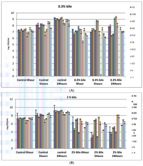 (A) Bile tolerance of LAB strains (K5, K20, J20, and J22, T12, T8, D12, D7, I12, V and Y) cultured in 0.3% bile and incubated at 37 °C for 24 h. Each bar represents the mean of duplicate determinations (n = 3); (B) Bile tolerance of LAB strains at 2% bile. Each bar represents the mean of duplicate determinations (n = 3). Isolate codes (K5, K20, J20, J22, T12, T8, D12, D7 and I12) represented by single letter and number indicate the strain number where the strains were isolated.