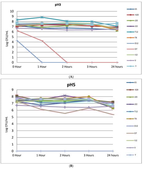 Since probiotics are administered orally, LAB strains have to survive the varying bile concentrations in the gastrointestinal tract and remain viable in high concentration (106–108 cfu/mL) to be considered as probiotics. It is reported that the liver releases about 1 L of bile, which decreases the survival of probiotic cells in the GIT [,].Consequently, studies have adopted 0.3% bile concentration as a standard for selection of bile tolerant probiotics [,]. In this study 90.9% of K5, K20, J20, J22, I12, T8 and T12 were able to survive 0.3% bile and remain viable in a high concentration record of 6 log10 cfu/mL as depicted in Figure 2A,B. The findings of the study are in line with other researchers [,,] who have observed a survival growth rate of more than 6 log10 cfu/mL for Lb. brevis CE94, Lb. brevis CE85, Lb. plantarum CE42, Lb. plantarum CE60 and Lb. plantarum CE84 in 0.3% ox gall. In another study conducted by [] it was observed that Lb. acidophilus was inhibited in 2% bile after 15 h although it still achieved 5 log10 cfu/mL colony counts. Therefore, LABs recovered from ting stand a higher chance of surviving fluctuating concentrations of bile salts in the intestinal passage and remain viable in high numbers. Therefore, these can be further investigated for their application as therapeutic potential probiotic strains. Tolerance to bile is attributed to the bile salt hydrolase enzyme which is reported to confer protection through bile conjugation, which catalyzes a reaction in which glycine and taurine are de-conjugated [,,]. In addition to bile tolerance, pH is also considered as one of the important properties required for probiotic LABs to survive in the gastrointestinal tract.