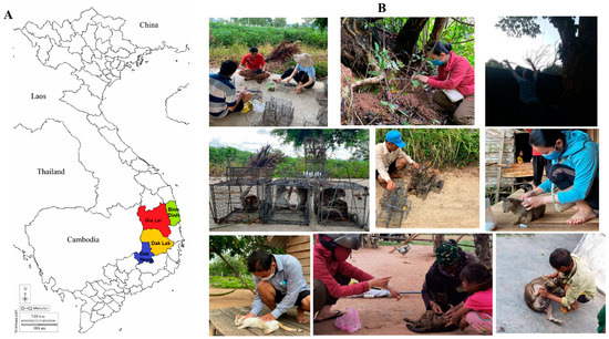 (A) Map of Vietnam showing the flea collection sites. (B) Field photographs of the wild rodents and domestic animal sampling collection beginning with type of trap used, trap preparation, trap setting, and pet owners’ support.
