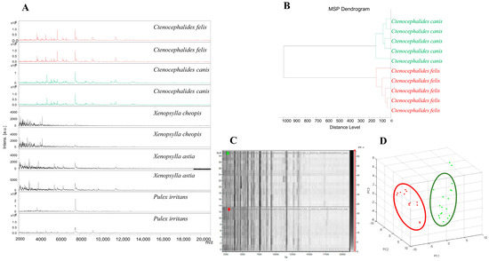 Building the database using comparison of MS spectra obtained from diverse flea species. Spectral alignment of five flea species using flexAnalysis software to show discriminative peaks; representative MALDI-TOF MS spectra from the cephalothorax of X. cheopis, X. astia, and P. irritans with low-intensity MS profiles and high background noise; representative MS spectra of C. canis and C. felis with high-quality spectra (peak intensity >3000 arbitrary units (a.u.), no background noise with baseline subtracted (A). Dendrogram of MALDI-TOF MS spectra of flea species collected in Vietnam. Biotyper software v.3.0 was used for cluster analysis (B). As confirmed with PCA, the MS spectra of various specimens demonstrated intraspecies reproducibility and interspecies specificity (C,D).