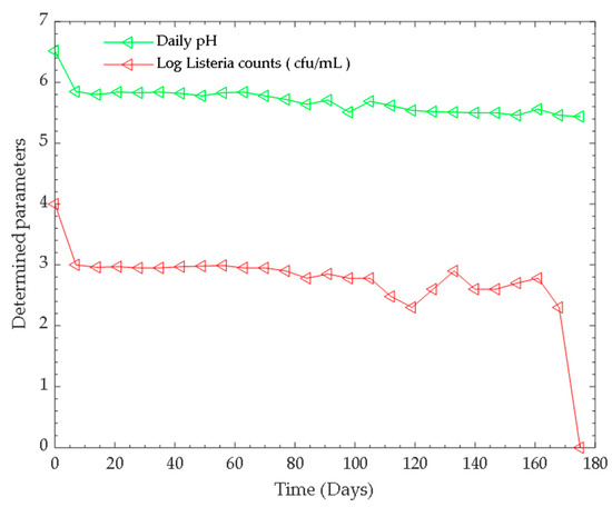 Throughout, the process was subjected to slight changes in temperature even within the two distinct phases. At the onset of the anaerobic digestion process, the temperature of the slurry was 18.4, the pH 6.52, and the Listeria counts was 1 × 104 cfu/mL (log bacterial counts was 4.0). As the temperature dropped to 16.81, there was a simultaneous decline in bacterial counts to 9 × 102 cfu/mL (log bacterial counts was 2.95). The mesophilic regimen occurred in the temperature range from 25.4 to 29 °C. With a sudden rise to 25 °C, a spike was observed in Listeria viable counts, which then decreased gradually until the end of the process, owing to the slight steady rise in temperature. After 175 days of anaerobic digestion, there was no growth in the 10−1 dilution sample as reported by Manyi-Loh and Lues [31]. So far, inactivation of bacterial pathogens via psychrophilic anaerobic co-digestion cannot be clearly attributed to a particular factor, but might be due to a combination of factors [31].