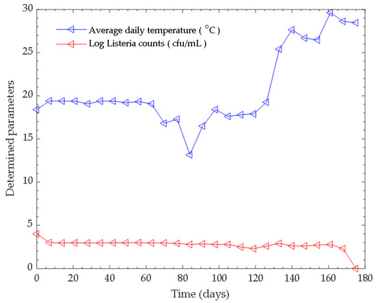 Anaerobic co-digestion occurred over a pH range of 5.46–6.52, and the temperature of the process was regulated at both psychrophilic and the mesophilic temperature ranges through the seven months period. The temperature range within the first five (5) months was termed as psychrophilic phase temperature, while in the latter two months, the temperature range of the process was described as the mesophilic phase temperature. The influence of pH and temperature on the log viable counts of Listeria monocytogenes is shown in Figure 1 and Figure 2.