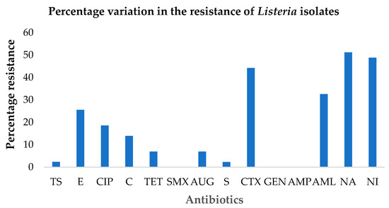 Data on antibiotic resistance profiling of the isolated Listeria species presented in Figure 3 is a cause for concern from the environmental and public health perspective. Not only does surveillance of antimicrobial resistance provide an indication of the magnitude of current trends in the antibiotic resistance pattern, it can also help to evaluate the effectiveness of control measures that are being implemented to mitigate the crisis. The percentage resistance ranged from 0 to 51.16% of the different tested antibacterial agents that are commonly used in veterinary and human medicines. The observed resistance demonstrated by the Listeria species occurred in the order; nalidixic acid (51.16%), nitrofurantoin (48.83%), cefotaxime (44.19%) and amoxicillin (32.56%). This is in contrast with the finding of Sanlibaba et al. [38] who demonstrated total resistance (100%) to nalidixic acid of all the L. monocytogenes strains involved in their study. Interestingly, Troxler et al. [75] mentioned the natural resistance of Listeria species to older quinolones, especially nalidixic acid, demonstrating restricted activity against Gram-positive organisms, including Listeria species.