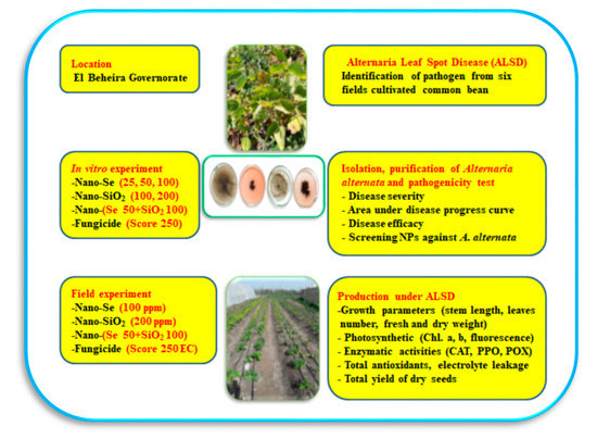 The present study involved two kinds of potential nanofungicides; the first was a biological nano-Se, and the second was nano-SiO2 that was prepared by a physical method. Our study was conducted to identify the most effective agent against the studied pathogen (A. alternata). We selected the phytopathogen of Alternaria in our current study. Several species of the Alternaria genus are well-known as phytopathogens, which infect many genera of vegetables and fruits. These species have a saprophytic nature, and their pathogenicity actions were due to toxins and cell-wall degrading enzymes [57]. Among those are Alternaria dauci, A. solani, A. tenuis, A. brassicae, A. brassicicola, and A. alternata. This study focused on A. alternata as a common phytopathogen, which could cause severe leaf spot problems in the common bean. A. alternata is also considered one of the most important diseases affecting common bean plants under the temperate conditions, as a serious foliar ailment causing massive yield reductions [11,26]. In addition, other crops have been infected, such as faba bean Vicia faba L. [15], tomato [57], apple [12], and orange Citrus spp. [58].