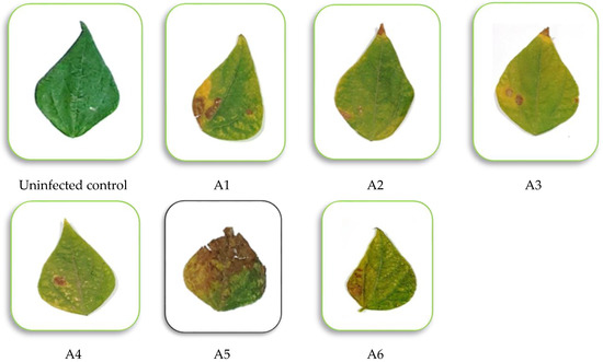 A greenhouse experiment was conducted to assess the pathogenic ability of the six isolates. The Alternaria isolates were able to infect the susceptible bean cultivar Giza 12 and caused typical leaf spot symptoms, whereas the isolate A5 (Alternaria alternata) was the most aggressive one in the experiment (Table 2 and Figure 2). The A5 isolate had the highest disease severity value (78.23%); however, the other isolates varied in their degrees of disease severity. Consequently, the A5 isolate of A. alternata was chosen for following studies.