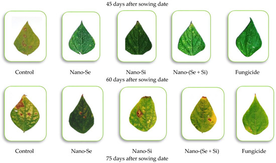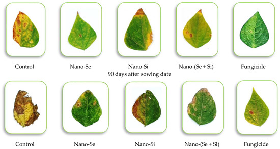 Under biotic stresses, plants should be armed with enzymatic and/or non-enzymatic antioxidants. In our study, this included enzymatic activities, electrolyte leakage, and total antioxidants. This defense system, in general, evolves different systemic signaling pathways (i.e., calcium, reactive oxygen species (ROS), and phytohormones). The application of the studied NPs showed that they had the ability to enhance the plant resistance to phytopathogens, probably as a result of producing ROS or phytohormones [64]. We showed that the biological nano-Se recorded the highest values in CAT, PPO, and POX enzymes, as well as the total antioxidant content, followed by the combined application of nano-Se and nano-silica at half doses. This finding confirmed the protective role of both nano-Se and nano-Si against oxidative stress, in this study, as a result of biotic stress. This was shown by the increased activity of the enzymatic antioxidants, which reduced the ROS and decreased the lipid peroxidation [35]. The distinguished role of biological nano-Se was confirmed in previous studies in other crops. The effectiveness of biological nano-Se has been confirmed in different studies and under different stresses, such as cucumber under salinity and heat stress [65], wheat under Fusarium root-rot disease [66], pak choi under heavy metal toxicity [67], and rapeseed under salinity stress [68], whereas the biological silicon-NP improved the common bean yield under heavy metals and salinity stress [38]. In this study, we confirmed its effect against the Alternaria leaf spot disease in the common bean.