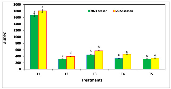 Area under disease progress curve (AUDPC) of the leaf spot disease on common bean in the field experiments, and where T1 = negative control, T2 = 100 ppm nano-Se, T3 = 200 ppm nano-Si, T4 = 1/2 nano-Se + Si, and T5 = fungicide (Score 250 EC at 1 mL/2 L). Results from the 2021 and 2022 seasons. Same letter above the error bar indicates no significant differences.