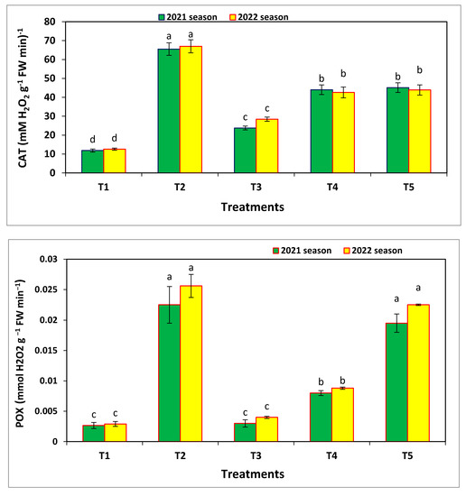 To determine the antioxidant enzymatic activities (catalase, peroxidase, and polyphenol oxidase), 0.5 g of fully expanded young leaves were homogenized in liquid nitrogen with 3 mL of extraction buffer (50 mM TRIS buffer (pH 7.8) containing 1 mM EDTA-Na2 and 7.5% polyvinylpyrrolidone)) using a pre-chilled mortar and pestle. The homogenate was filtered through 4 layers of cheesecloth and centrifuged at 12,000 rpm for 20 min at 4 °C. The supernatant, which was re-centrifuged at 12,000 rpm for 20 min at 4 °C, was then used for the total soluble enzymatic activity assay. The enzymatic activities were measured colorimetrically using a double-beam UV/visible spectrophotometer Libra S80PC (TechnoScientific Company, Nottingham, UK), 70 days from sowing.