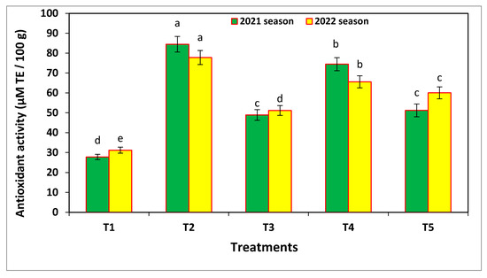 Effects of the different treatments on total antioxidant activity and electrolyte leakage measured 70 days after sowing in the field experiments in 2021 and 2022. Results are given as mean values ± standard error bars and where T1 = negative control, T2 = 100 ppm nano-Se, T3 = 200 ppm nano-Si, T4 = 1/2 nano-Se + Si, and T5 = fungicide (Score 250 EC at 1 mL/2 L). Same letter above the error bar indicates no significant differences.