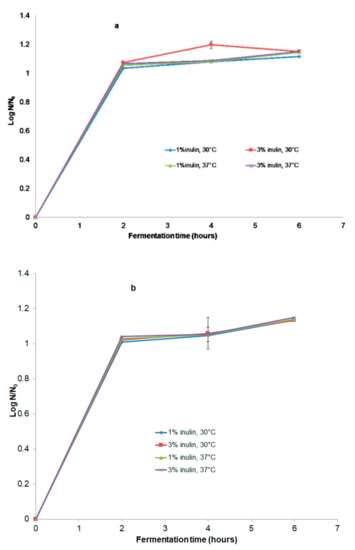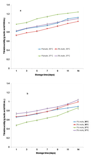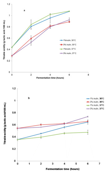 As shown in Figure 3a,b, the titratable acidity of the samples increased alongside the decrease in pH for all samples. The titratable acidity reached 1.07 g lactic acid 100 mL−1 for the sample with 1% inulin and 0.89 g lactic acid 100 mL−1 for the sample with 3% inulin and SBS fermented at 30 °C, post 6 h of fermentation. For the SBS samples fermented at 37 °C, the titratable acidity reached 1.08 g lactic acid 100 mL−1 and 0.93 g lactic acid 100 mL−1. At the end of the fermentation, there was approximately 0.65 g lactic acid 100 mL−1 and 0.48–0.74 g lactic acid 100 mL−1 for SBP beverages with 1% and 3% inulin, respectively, fermented at 30 °C and 37 °C.