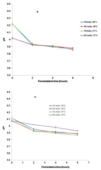The pH values of all beverages (Figure 2a,b) decreased from the initial pH of 4.21, 4.01 to 3.87 and 3.88 for the SBS samples fermented at 30 °C and 37 °C with 1% and 3% inulin, respectively. For SBP beverages, the pH values after 6 h of fermentation were similar—3.89 at 30 °C for both beverages and 3.86, 3.92 at 37 °C for beverages with 1% and 3% inulin, respectively. The pH decrease was caused by the production of organic acids.