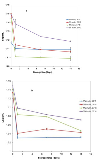 It can be observed from our results that the L. casei® 431 strain has good survival rates without nutrient supplementation in all beverages. Figure 4a,b presents the changes in the cell viability of the L. casei® 431 strains (p < 0.05) for the 14 days of cold storage at 4 ± 1 °C. This evaluation began after the end of the 6 h of fermentation. There was a reduction in the viability of L. casei® 431 cells after one day of storage in all formulations. At the end of the storage period, the total viable cells of L. casei® 431 were decreased moderately to 1.11·107 for the SBS beverage with 1% and 1.15·107 for the SBS beverage with 3% inulin, fermented at 30 °C, and 1.14·107 and 1.15·107 CFU·mL−1 for the SBS beverage with 1% and 3% inulin, fermented at 37 °C (Figure 4a), respectively. However, the SBP beverage with 1% and 3% inulin fermented at 30 °C and 37 °C presented a bigger population of L. casei® 431 compared to all the formulations (p < 0.05). After the storage period, the viability of L. casei® 431 remained at an acceptable level (over 107 CFU·mL−1).