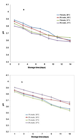 Figure 5a,b presents the pH evolution (p < 0.05) for all samples during the storage period. The pH ranges between 3.61 and 3.64 for the SBS beverage with 1% inulin fermented at 30 °C and 37 °C, respectively, and 3.59 for SBS with 3% inulin for both temperatures of fermentation after storage time. However, for the SBP beverages, the pH decreased gradually over time (p < 0.05), ranging between 3.57–3.64 and 3.54–3.67 for samples fermented at 30 °C and 37 °C, respectively.