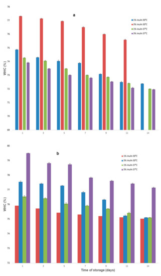 During the period of storage, the WHC was higher for the beverages fermented at 30 °C and 37 °C (Figure 7a,b). Regardless of the inulin, the WHC increased with the increase in inulin concentration. As shown in Figure 7, the WHC of SBS and SBP fermented at 30 °C and 37 °C, respectively, with 3% inulin, was significantly higher than that of other groups (p < 0.05). SBP beverage with 3% inulin fermented at 37 °C had the largest water-retention capacity, while the WHC of SBS was only 71.96%, which was the weakest.