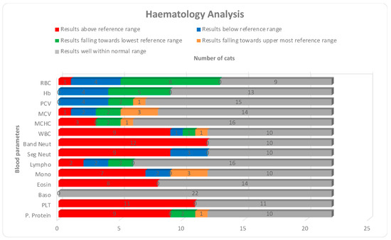 Comparison of changes in hematology parameters in a total of 22 cats with reference to their reference range.
