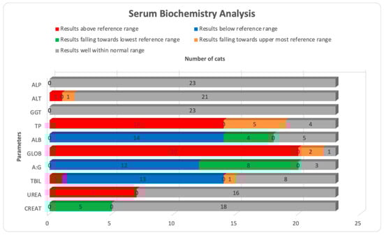 Comparison of changes in serum biochemistry parameters in a total of 23 cats with reference to their reference range.