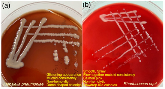 Growth appearance and colony characteristics of (a) K. pneumoniae and (b) R. equi on 5% defibrinated horse blood agar, isolated from trachea and pleural effusion samples of two cats investigated for acute/chronic infectious respiratory disease signs.