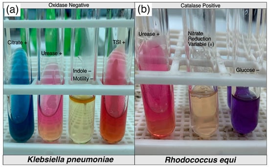 Conventional biochemical testing results of (a) K. pneumoniae and (b) R. equi, isolated from trachea and pleural effusion samples of two cats investigated for acute/chronic infectious respiratory disease signs.