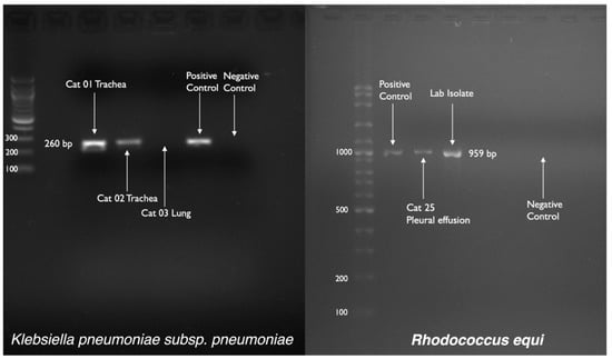 PCR reactions and gel electrophoresis conditions for the detection and/or confirmation of the K. pneumoniae and R. equi from cats.