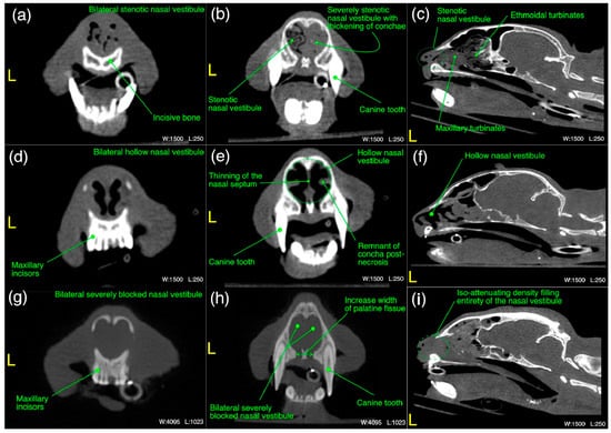 (a–i) A variety of computed tomographic changes of nasal vestibule region are labeled for pathologies related to acute/chronic infectious respiratory disease signs in Cats 1, 10 and 20. Window, level and laterality are also labeled for each section.