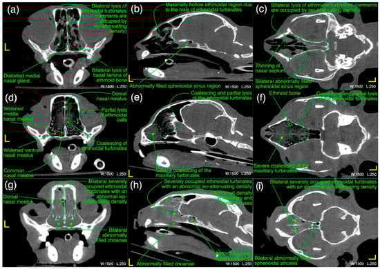 (a–i) A variety of computed tomographic changes of ethmoidal region are labeled for pathologies related to acute/chronic infectious respiratory disease signs in Cats 1, 6 and 18. Window, level and laterality are also labeled for each section.