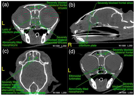 (a–d) A variety of computed tomographic changes of frontal sinus region are labeled for pathologies related to acute/chronic infectious respiratory disease signs in Cats 12 and 21. Window, level and laterality are also labeled for each section.