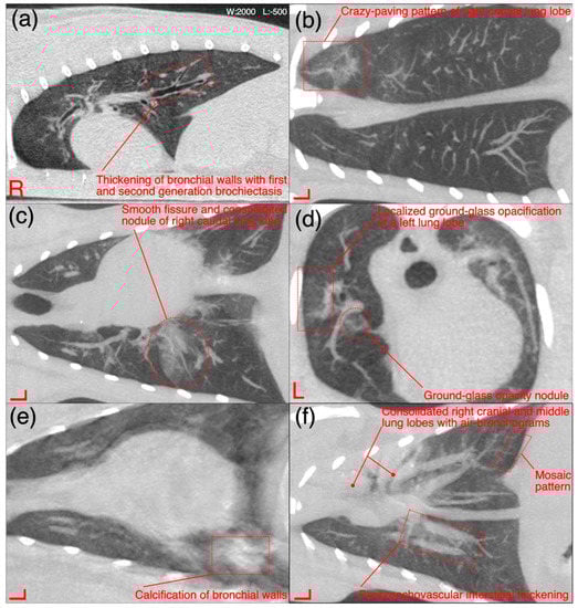 (a–f) A variety of computed tomographic changes of pulmonary parenchyma and its related vasculature are labeled for pathologies related to acute/chronic infectious respiratory disease signs in Cats 5, 8, 12 and 21. Window and level are same for all sections and laterality is also labeled for each side.