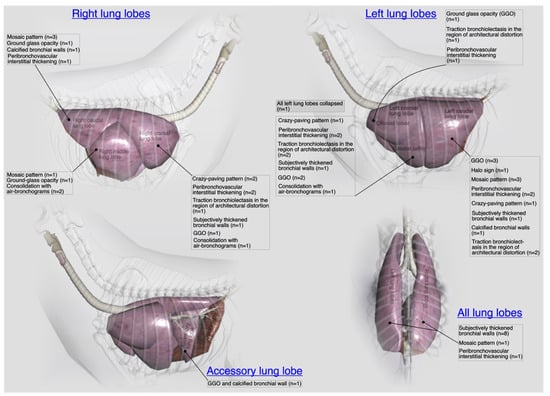 An illustrative summary of the localized computed tomographic abnormalities of the pulmonary parenchyma (individual lung lobes and lobules) and their relevant blood vessels in terms of their laterality in a total of 22 cats presented with acute/chronic infectious respiratory disease signs.