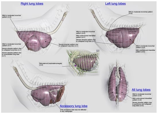 An illustrative summary of the localized radiographic abnormalities (patterns) of the pulmonary parenchyma (individual lung lobes and lobules) and their relevant blood vessels in terms of their laterality in a total of 27 cats presented with acute/chronic infectious respiratory disease signs.