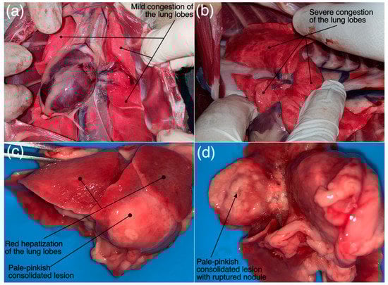 (a–d) Gross pathological findings (labeled) of (a) Cat 1 positive for FCoV and FCV antibodies and (b) Cat 2 positive for FIV, FCoV, FCV and FHV antibodies, presented with acute/chronic infectious respiratory disease signs and (c,d) Cat 25 diagnosed with pulmonary form of the feline rhodococcosis.
