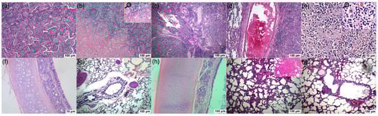 (a–j) Bronchopneumonia due to R. equi in Cat 25 (a–e). Cat 01 (f,g) positive for FCoV and FCV antibodies and Cat 02 (h–j) positive for FIV, FCoV, FCV and FHV antibodies were presented with acute/chronic infectious respiratory disease signs. K. pneumoniae was isolated from trachea of both cats. Photomicrograph (a) indicates severe infiltration of the mononuclear and polymorph inflammatory cells in alveolar spaces; (b) coagulative necrosis in lung tissue; (c) severe infiltration of the alveolar spaces with mononuclear inflammatory cells; bronchial lumen was infiltrated with inflammatory exudate, proteinaceous material and sloughed epithelial cells; necrosis and degeneration of the bronchial epithelium and severe infiltration of the peri-bronchial spaces with mononuclear inflammatory cells; (d) severely engorged arterial blood vessel with blood and necrosis and severe infiltration of the inflammatory cells in the surroundings; (e) severe infiltration of the alveolar spaces with mononuclear inflammatory cells especially macrophages and lymphocytes highlighted in magnified area; (f) normal trachea (g) relatively normal bronchus and alveolar spaces with congested blood vessels in surrounding and the highlighted area at the upper right corner shows acute congestion (mild) of the lung tissue being examined at higher magnification; (h) normal trachea with mildly sloughed epithelial cells in tracheal lumen; (i) severely congested and edematous alveolar walls and interstitial spaces; (j) relatively normal section of the lung tissue with mild congestion and edema of the alveolar walls and interstitial spaces. (H&E: Hematoxylin and Eosin; 40×–400×).
