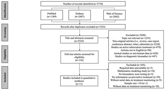 As shown in Figure 1, a total of 5718 articles were obtained by database searches using different combinations of key terms. After removing duplicates, 5325 records were screened by title and abstract, of which 121 full texts were retrieved for detailed evaluation. Supplementary Table S4 shows a list of excluded studies with reasons. Of the excluded 105 articles which underwent full-text screening, 59 were excluded due to no information on TB preventive treatment, 18 due to mathematics modeling studies, 9 due to no serial data on TB preventive treatment monitoring, 5 due to no biomarkers being tested, 10 due to no data on treatment monitoring, 3 due to the required data being unavailable and 1 due to a sample < 10. Finally, 11 studies were eligible for data extraction and quantitative analysis [,,,,,,,,,,] and are listed in Supplementary Table S5.