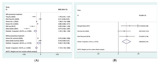 The extracted data were first transformed and standardized as mean and standard deviation (SD) values. The Box–Cox (BC) method [,] was applied to estimate the sample mean and SD from studies that reported the median accompanied by first and third quartiles. Standardized mean difference (SMD) was calculated as the effect size for each biomarker and summarized it using the random-effects model based on the Hartung–Knapp–Sidik–Jonkman method after adjustment to Hedges’ g [,]. SMD was applied because different testing methods would be used to measure the same outcomes. Confidence intervals (CIs) were converted to SDs. When measures of variation were missing for mean differences within each treatment arm of a given study but a test of difference between treatment arms was reported, we converted F-statistics, t-statistics and p-values to standard errors and SDs. Here, t was taken as the square root of F, and it was assumed that the SDs of the mean differences in each treatment arm were equal. However, if the study showed no test of difference between groups, we used the highest SD recorded in the same meta-analysis for each treatment arm instead of the study’s own data. At least two studies were required for each meta-analysis []. When studies included more than two intervention groups, we excluded irrelevant groups or combined relevant groups as recommended in the Cochrane Handbook in order to avoid arbitrary decisions []. For example, a regimen of isoniazid (INH) and rifapentine for 3 months (3HP) was compared with a regimen of INH for 6 months (6H) and 9H regimen group. Using the formula provided for combining two treatment groups (Cochrane Handbook 6.5.2.10, 23.3.4), when we aimed to target 3HP regimen as a subgroup, we calculated the combined mean difference and SD for 6H regimen and 9H regimen groups as a single control group.