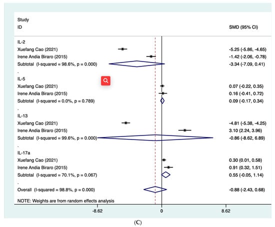 For biomarkers where there were two or more studies that numerically presented the dynamic levels at different follow-up time points, then meta-analysis was further performed. For INF-γ, the summarized SMD was found to be −1.44 (95% CI: −1.85, −1.03) for those who completed preventive treatment (τ2 = 0.21; I2 = 95.2%, p < 0.001) and −0.49 (95% CI: −1.05, 0.06) for those without preventive treatment (τ2 = 0.13; I2 = 82.0%, p < 0.001) (Figure 3A). With respect to QFT-Plus testing, which reflected the levels of TB1 and TB2 tube antigens, we summarized their status after treatment, such as reversion or conversion of MTB infection, based on the reported results of included studies. The summarized rate of reversion was observed to be 9.3% (4.3–14.3%) after preventive treatment (τ2 = 0; I2 = 0%, p = 0.613) (Figure 3B). In addition, four cytokine proteins, IL-2, IL-5, IL-13 and IL-17a, were analyzed using quantitative synthesis (Figure 3C). The results of this meta-analysis found that the CI for these four biomarkers crossed the null and therefore did not reach statistical significance.