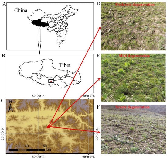 Information of sampling sites in the typical mountain meadow of Qinghai-Tibet Plateau. (A–C) Geographic information of sampling site. (D–F) The degree of grassland degradation in the sample site was different.