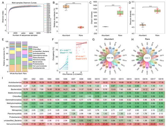 Alpha diversity and composition of abundant and rare bacterial taxa in degraded grassland soils of Tibet. (A) Shannon index curve of sequence number showed all soil samples. (B) Relative abundance of abundant and rare bacterial taxa in whole bacterial communities. (C,D) Chao1 richness and Shannon diversity of abundant and rare bacterial taxa. (E) Composition of abundant and rare bacterial taxa at the phylum level. (F) Abundance-occupancy relationship of abundant and rare bacterial taxa. (G,H) Petal diagram showing the shared pattern of abundant and rare bacterial taxa in degraded grassland soils. The number on each petal represents the number of ASVs per soil sample, and the number in the middle core represents the number of ASVs shared. (I) Heat maps show the relative abundances of the shared abundant bacterial taxa in different degraded grassland soils at the phylum level. Red means having a high relative abundance and green means having a low relative abundance. Asterisks denote significance (**: p-value < 0.01; ***: p-value < 0.001).